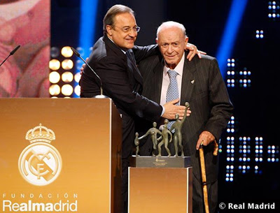 | Di Stefano, recibiendo de manos del presidente del Real Madrid, Florentino Pérez, el premio Alma 2010 por su trayectoria futbolística, |