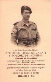 Pero no podemos dejar de mencionar la excepcional hazaña del teniente de paracaidista, don Antonio Ortiz de Zárate, quien al ir a socorrer el destacamento de Telata, en heroica resistencia ante el ataque de las hordas morunas, al mando de una sección de su unidad encuentra la muerte. Al ser recuperado su cadáver entre su pecho encontraron una ejemplar oración escrita, que haría carne en su tropa para siempre, decía así “…haz Señor que mi alma no vacile en el combate y mi cuerpo no sienta el temblor del miedo. Haz que yo sea tal en la guerra como lo fui en la paz. Haz que el silbido agudo de los proyectiles alegre mi corazón…”