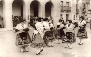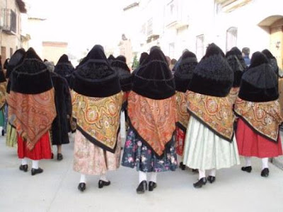 Tarde: traje de labradora, manteos de fieltro rojos o amarillos, mandil de lentejuelas, pañuelo blanco bordado con lentejuelas y lazo de terciopelo y lentejuelas en la cabeza, medias blancas.