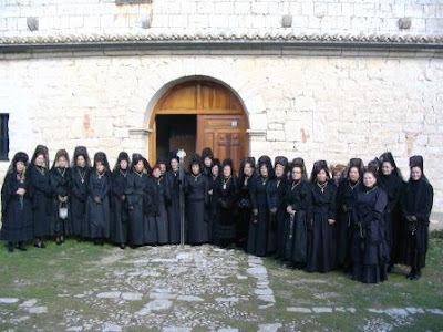 Mañana: Se vestirá de riguroso luto para la misa por las cofrades difuntas. Traje negro, con mantilla española, que puede llevarse con peineta o sobre los hombros. Se completa el traje con guantes, misal, rosario y bolsito.