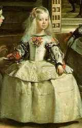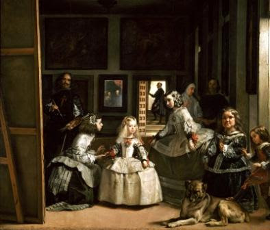 Velázquez plantea esta joya de la pintura-Las Meninas- dentro de una gran sala decorada con cuadros, donde observamos-en un primer plano- a un enano que apoya su pié sobre un perro tumbado, una bufona, una niña que mira fijamente a la princesa Margarita que es atendida por una dama, y un pintor -que es el mismo Velázquez- delante de un gran lienzo.