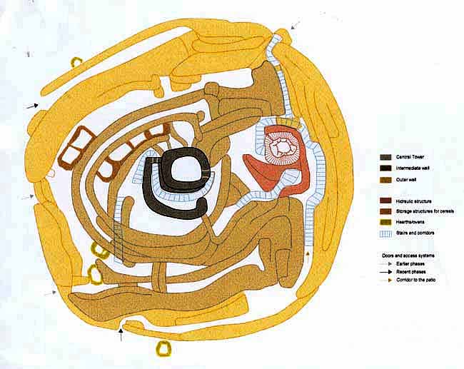 Estamos por tanto ante un castillo que se construyó hace cuatro milenios con el fin de almacenar dentro de sus muros las reservas de cereales de la comunidad, trigo y cebada que al principio se guardaban en almacenes o silos de planta rectangular y luego dentro de grandes recipientes cerámicos fabricados a mano. También existen indicios que indican que se estabulaba o guardaba el ganado dentro de los muros cuando era necesario: ovejas, cabras y cerdos. En el patio se ha encontrado un pozo que buscaba los niveles freáticos del río para garantizar el abastecimiento de agua dentro de la fortaleza. También la fortaleza servía como vivienda, al menos puntualmente, ya que entre los restos arqueológicos hallados se encuentran algunos hornos para cocinar y restos de actividades alfareras, y también se han hallado algunos enterramientos.
