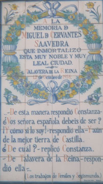 Cervantes conocía con detalle Talavera de la Reina, sus gentes (entre los se contaban varios familiares suyos), sus costumbres y fiestas. Y su cerámica. Los demuestra en diversos pasajes de sus obras. La última de ellas, a los trabajos de Persiles y Sigismunda, novela que termina unos días antes de su muerte, contiene el más entrañable elogio que se haya hecho de Talavera, al llamarla por boca de uno de sus personajes Ala mejor tierra de Castilla. En dicha novela los protagonistas pasan por nuestra ciudad, se alude a la fiesta de Las Mondas y, durante buen número de páginas se refiere la historia de La Talaverana, que se inicia en un mesón de Talavera y tiene su desenlace en Roma. Sólo por esta obra (considerando además las raíces talaveranas de la familia del escritor) Talavera merece ser tenida como un lugar cervantino.